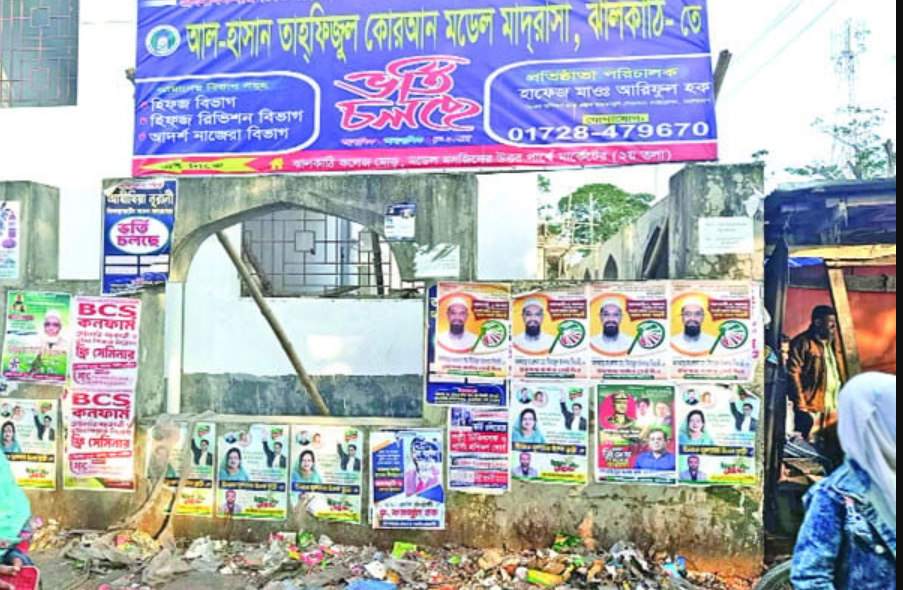নির্বাচন কমিশনের (ইসি) স্পষ্ট নিষেধাজ্ঞা থাকা সত্ত্বেও রাজধানীজুড়ে চলছে নির্বাচনি পোস্টারের বেআইনি মহোৎসব। প্রধান সড়ক, অলিগলি, বৈদ্যুতিক খুঁটি, দেয়াল, সেতুর পিলার থেকে ফুটওভার ব্রিজ সর্বত্র পোস্টারের ছড়াছড়ি। লাগানো হচ্ছে প্লাস্টিকের অপচনশীল ব্যানারও। নির্বাচনি আচরণবিধি উপেক্ষা করে প্রার্থী ও তাঁদের সমর্থকদের লাগানো পোস্টার-ব্যানারে ঢাকার দৃশ্যপট আবারও রূপ নিয়েছে বিশৃঙ্খল বিজ্ঞাপন নগরীতে। আচরণবিধিকে বুড়ো আঙুল দেখিয়ে পোস্টার-ব্যানার লাগানো হচ্ছে দেশের অন্যান্য এলাকাতেও। এসব দেখার কেউ নেই।