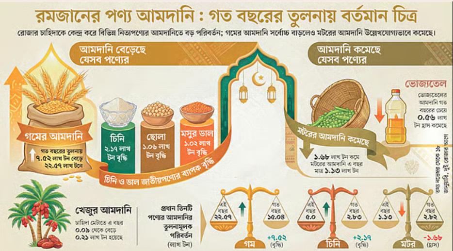 জাতীয় রাজস্ব বোর্ড (এনবিআর) থেকে পাওয়া গত আড়াই মাসের (১ নভেম্বর থেকে ১৮ জানুয়ারি) নিত্যপণ্য আমদানির তথ্য বিশ্লেষণ করে এ চিত্র পাওয়া গেছে। এ সময়ের মধ্যে সমুদ্র ও স্থলবন্দর দিয়ে যেসব পণ্য খালাস হয়েছে, তার বাইরে আমদানির পাইপলাইনেও রোজার পণ্য রয়েছে।